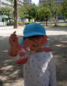 「いっぱいあったよー!」「こんな形の見つけた!」と様々な色の葉っぱを拾ったよ(^^)