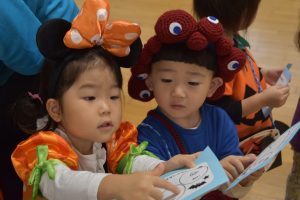 ハロウィンの由来を聞いたり、保育士の出し物を見たりしてから