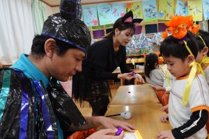 ハロウィンの由来を聞いたり、保育士の出し物を見たりしてから