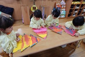 次はツリーにロウソクでお絵描きをして上から絵の具を塗りはじき絵を楽しみました♪