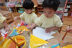 はじき絵では、描いた絵が浮かび上がると興味津々!「やっと描いたやつが見えてきた!」と