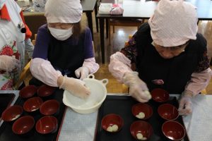 ゆがいた白玉を器に入れ、ぜんざいを作っていきます。