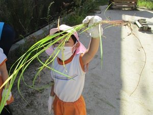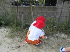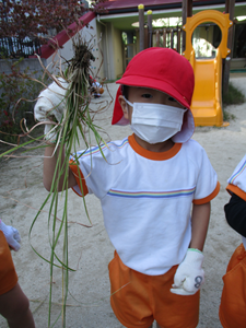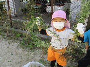 園庭に生えている、自分よりも大きな雑草を抜いていましたよ。