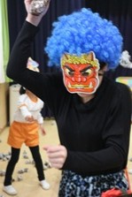 鬼の仮装をした先生に少し緊張気味の乳児組さん達でしたが、節分にちなんだクイズや先生たちからの出し物、豆に見立てた新聞紙を投げたりと夢中で豆まき会に参加し、笑顔が見られました(^▽^)