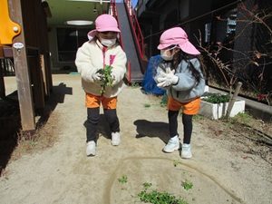 雑草抜きで園庭をきれいにしてくれたくま組さん!