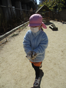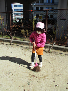 くま組さんには、ほうき・ちりとり等の掃除用具を用いて園庭の掃除をお願いしました♪
