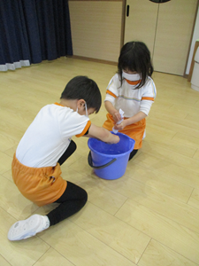 らいおん組さんは、卒園式で使うホールを雑巾がけしました。